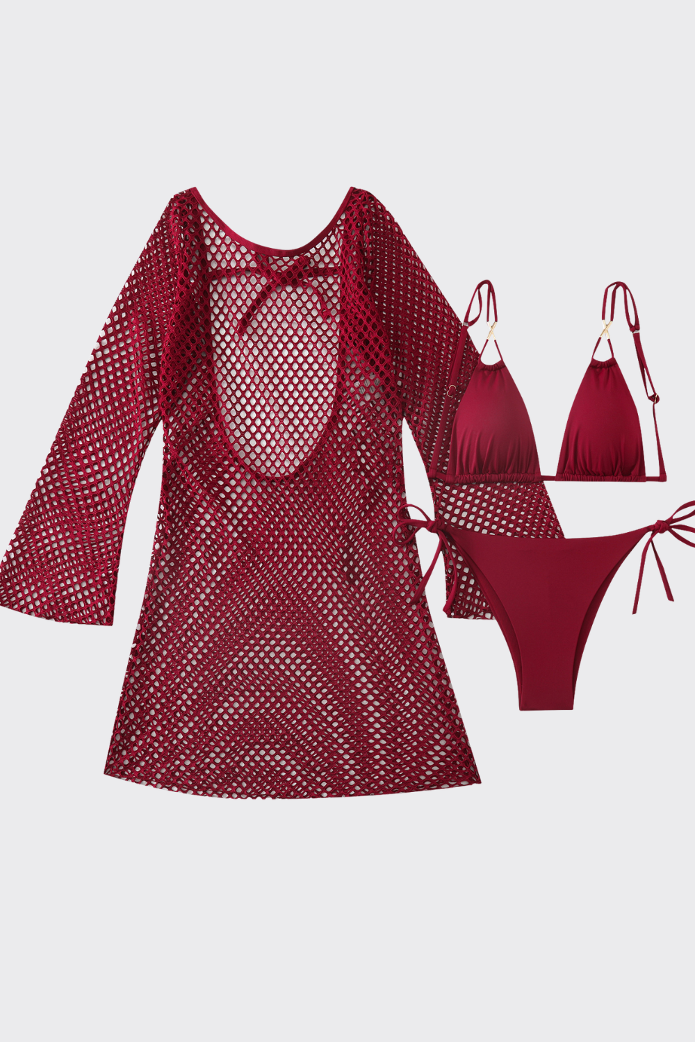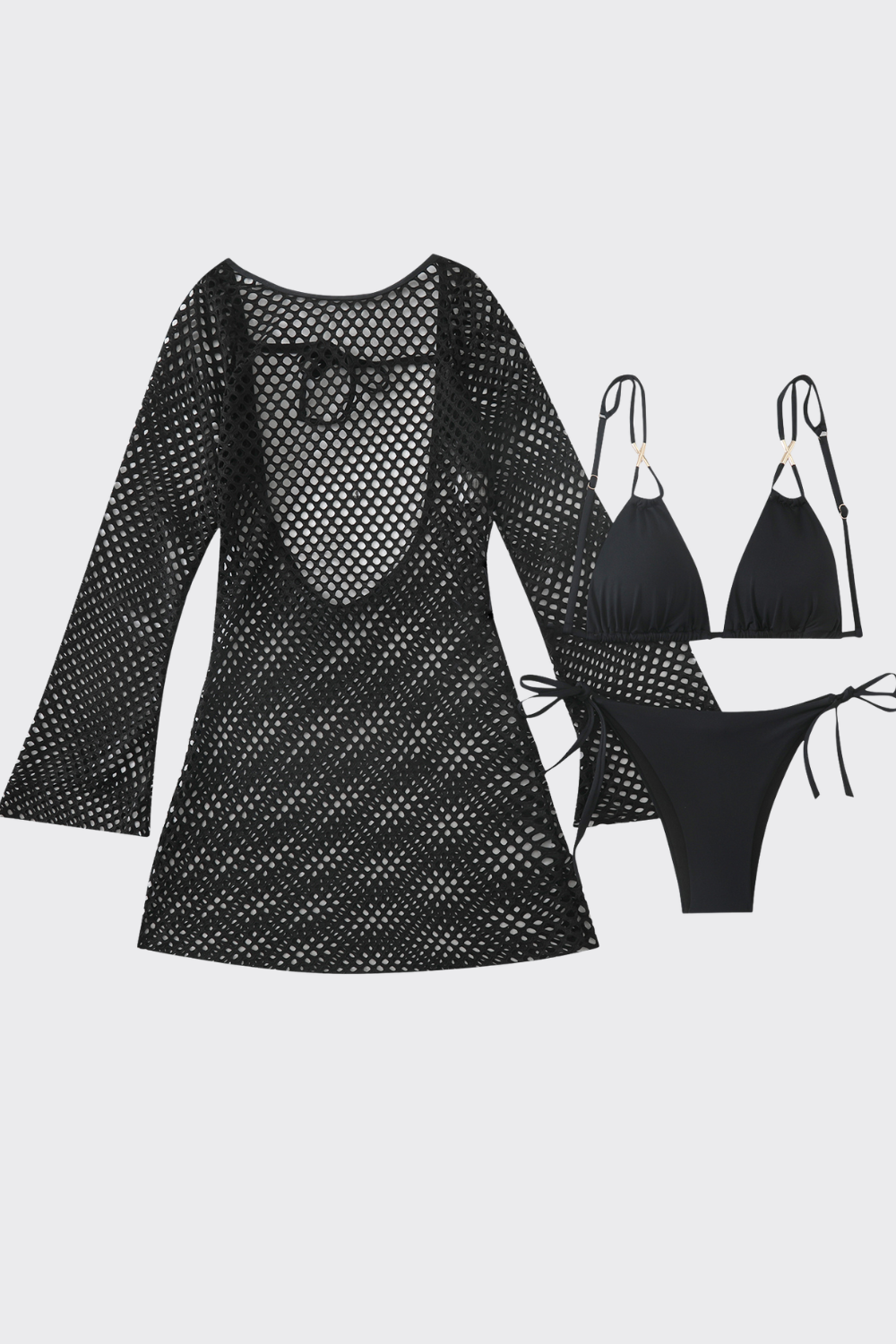 Este conjunto de tres piezas ofrece un look completo y coordinado para la playa o la piscina. Incluye un vestido de cobertura confeccionado en una malla de red cerrada con diseño de rombos, que presenta cuello redondo, manga larga fluida y un acabado mini. Debajo, el set se completa con un bikini de triángulo clásico sin aros y una braguita de talle bajo.