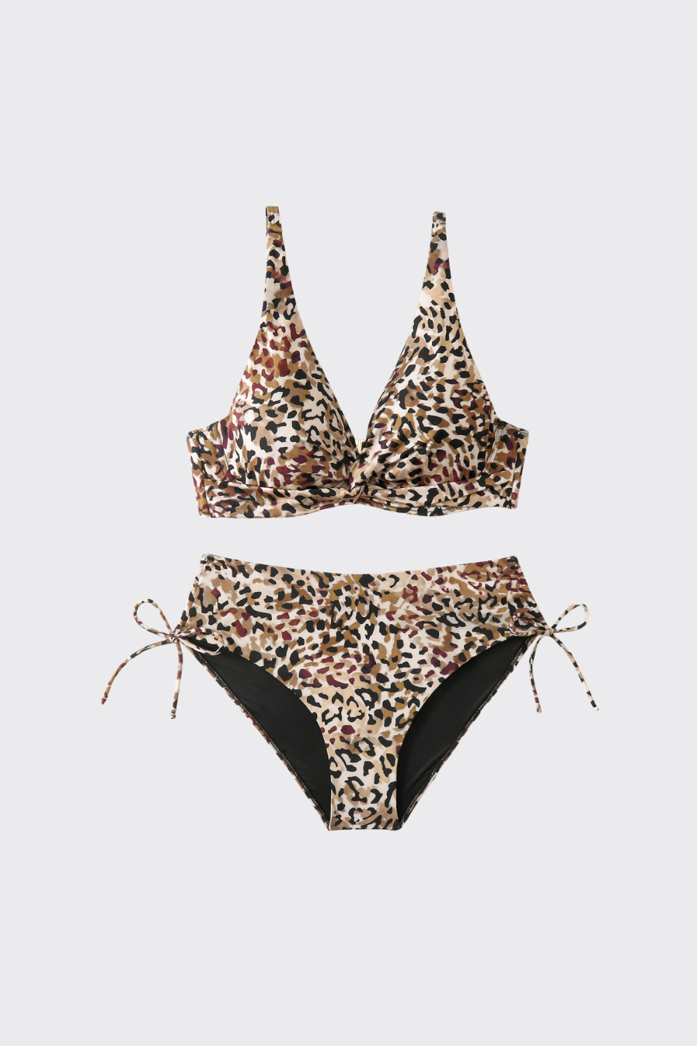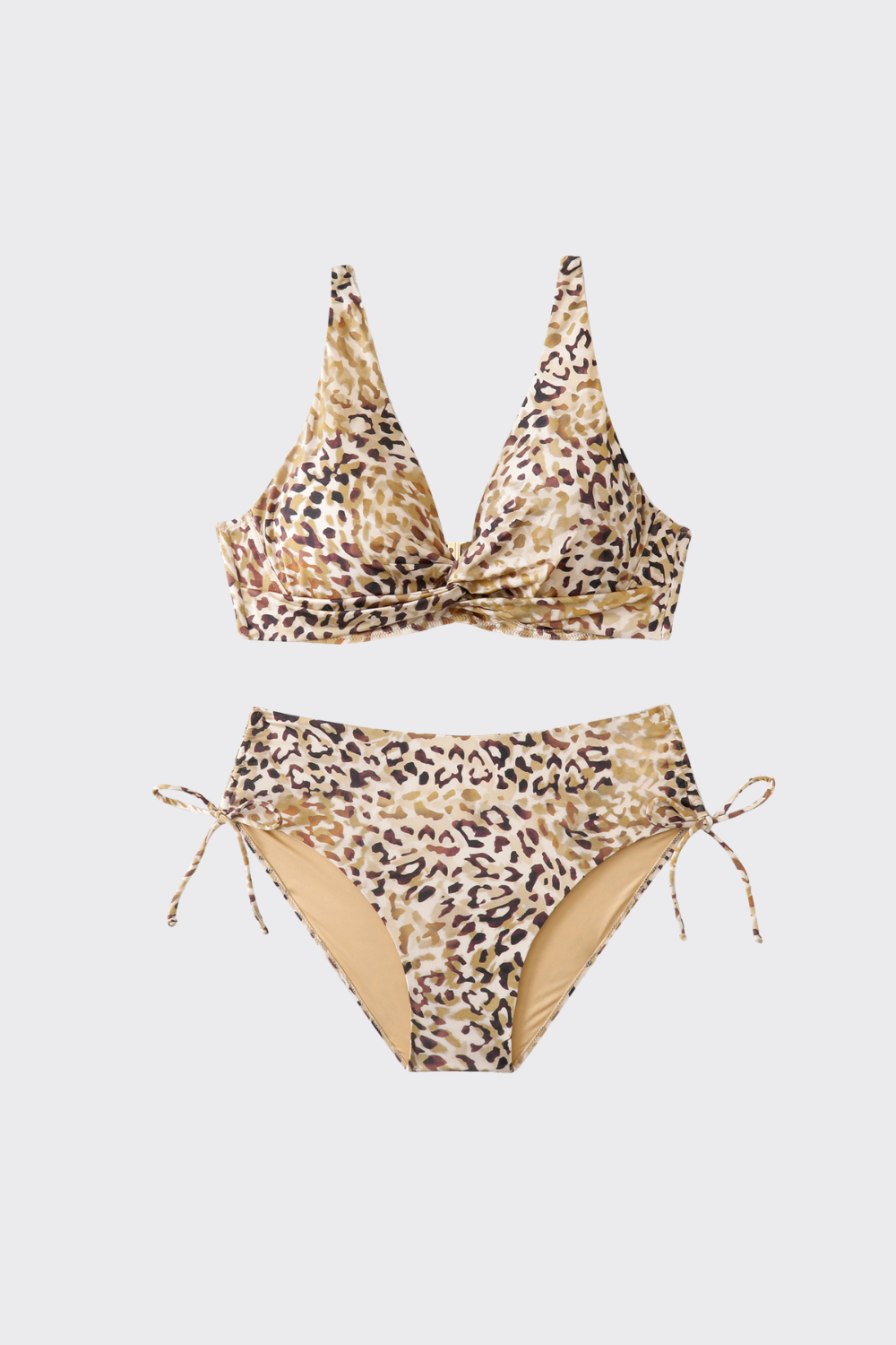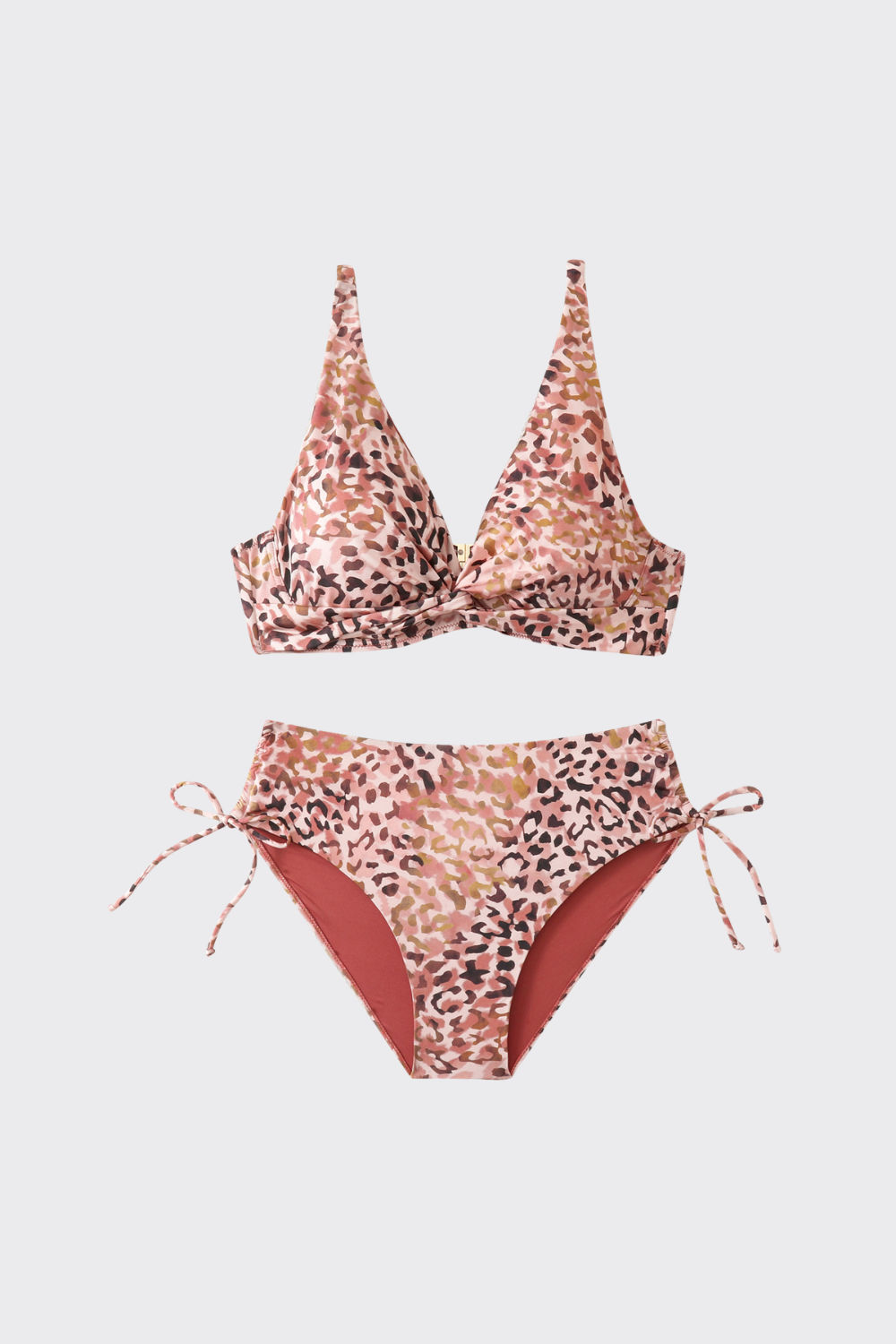 Abraza tu lado más natural con este bikini de estampado orgánico. El top destaca por su diseño de escote cruzado, que crea un drapeado fluido y una sutil abertura central que añade un toque femenino. Se coordina con una braguita de talle medio que presenta pliegues laterales fijos, diseñados para aportar textura y suavizar la línea de la cadera sin añadir volumen extra.