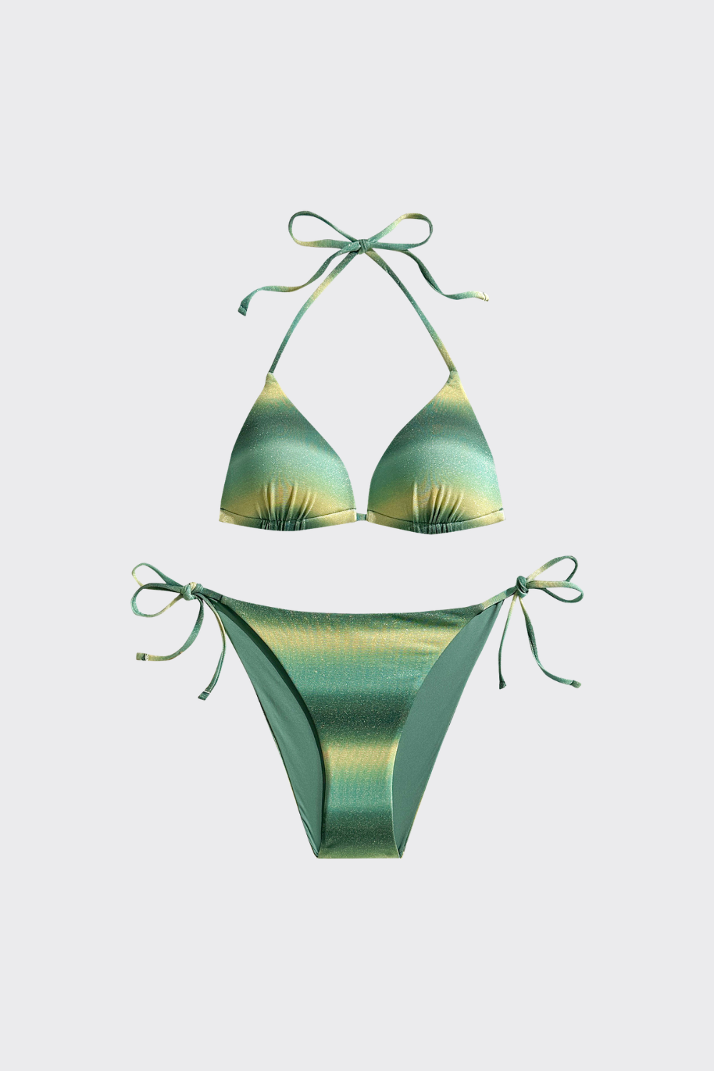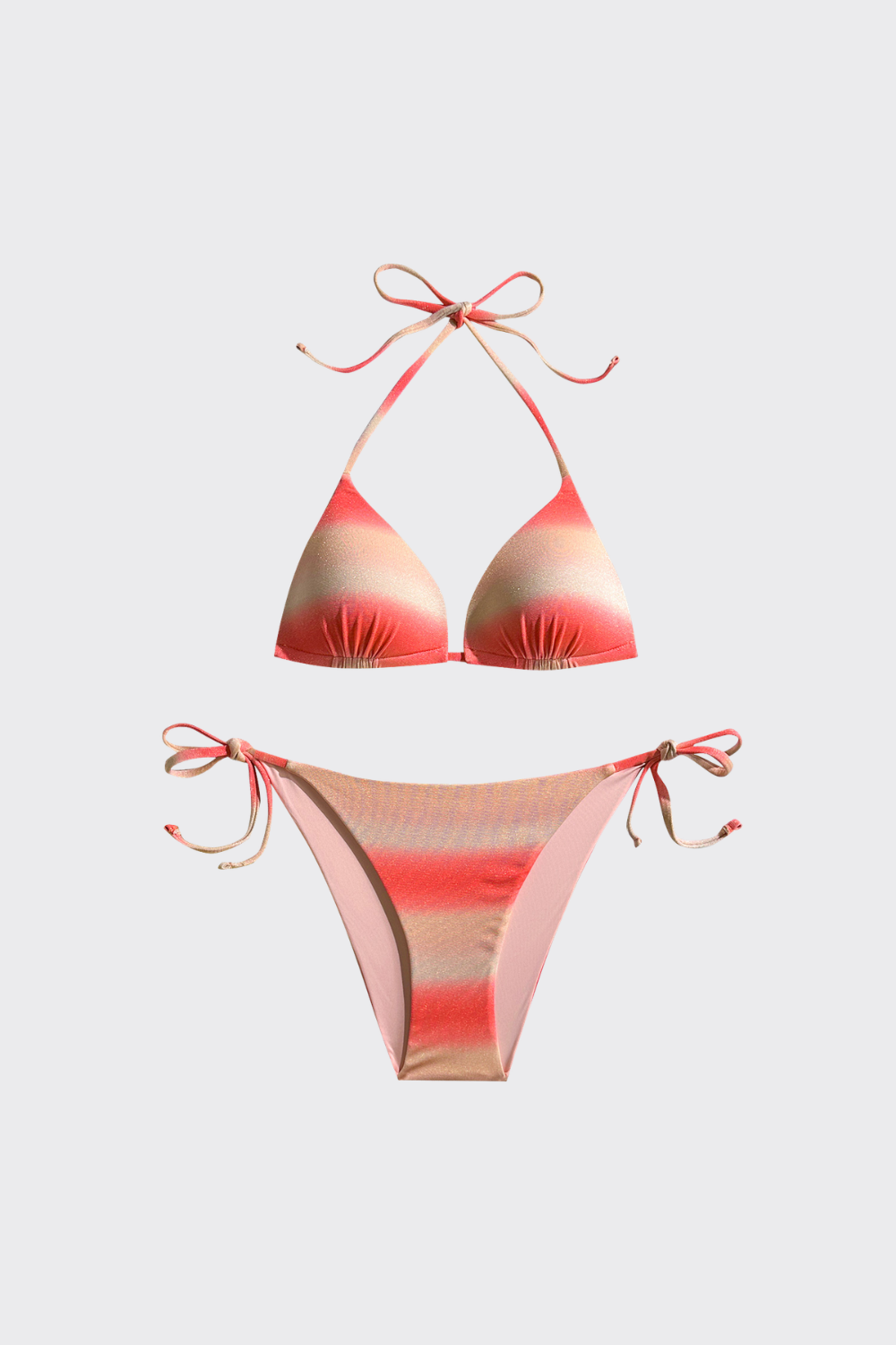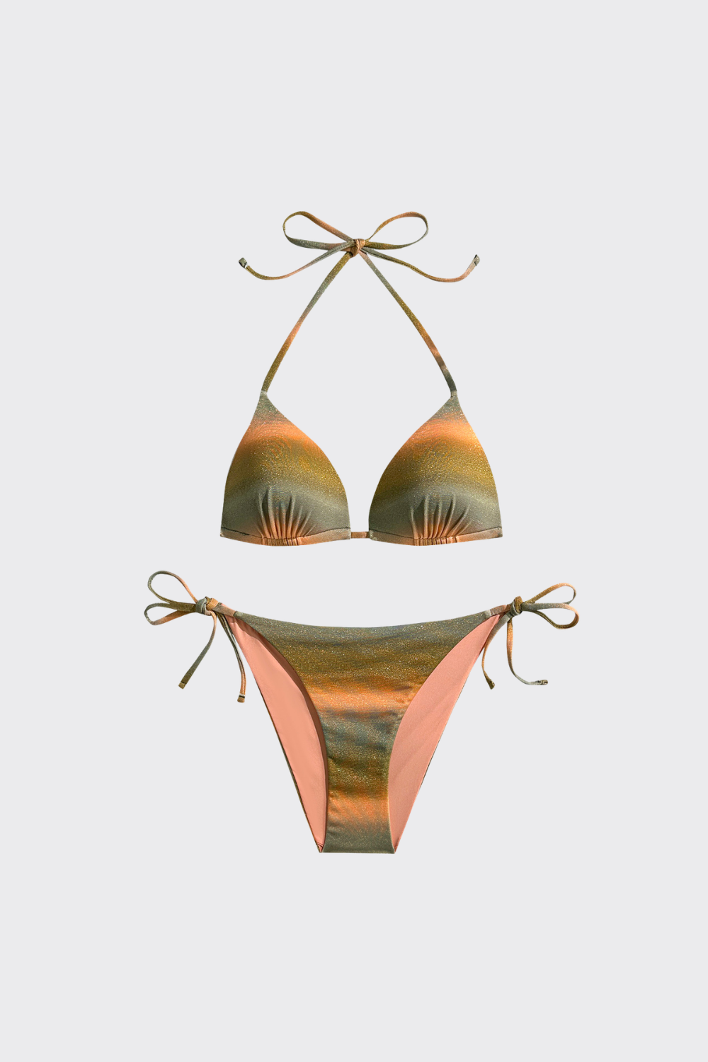Conjunto de dos piezas con un estampado en degradado de tonos tierra dispuesto en franjas horizontales. El top de triángulo prescinde de herrajes frontales para un look más limpio, mientras que la braguita de talle bajo incorpora lazadas laterales sencillas. El tejido presenta un ligero brillo satinado que realza la transición de colores.