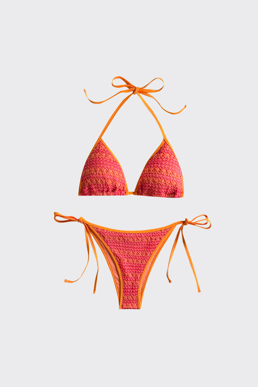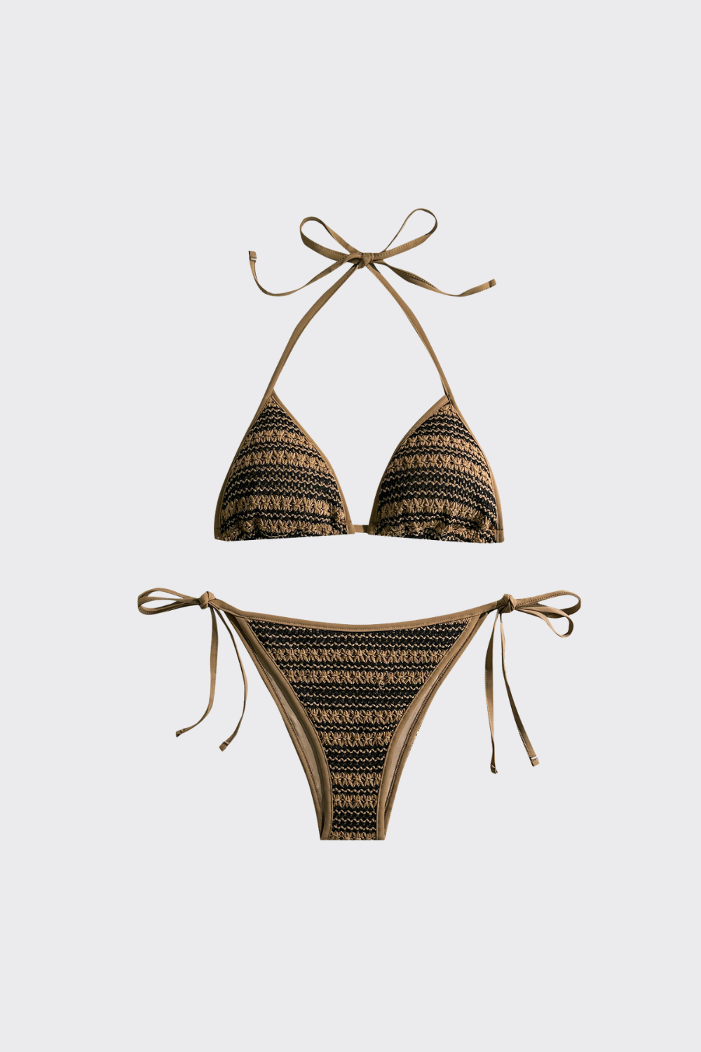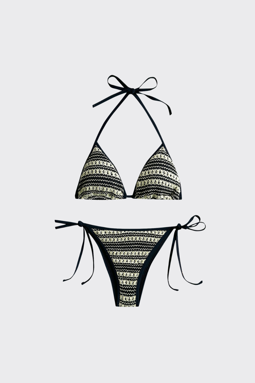 Este bikini de dos piezas apuesta por un estampado geométrico de inspiración tribal. El top de triángulo está ribeteado en negro sólido, lo que realza el patrón del tejido. La braguita de talle bajo incorpora lazadas laterales, manteniendo esa estética bohemia y artesanal que fluye con naturalidad entre las olas y la arena.