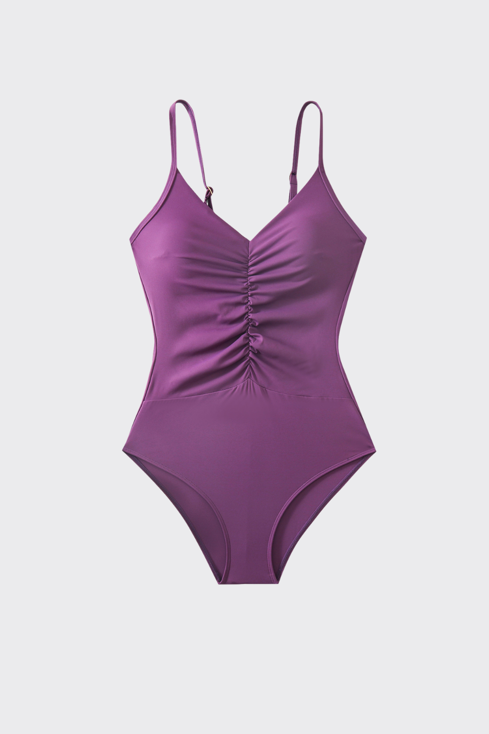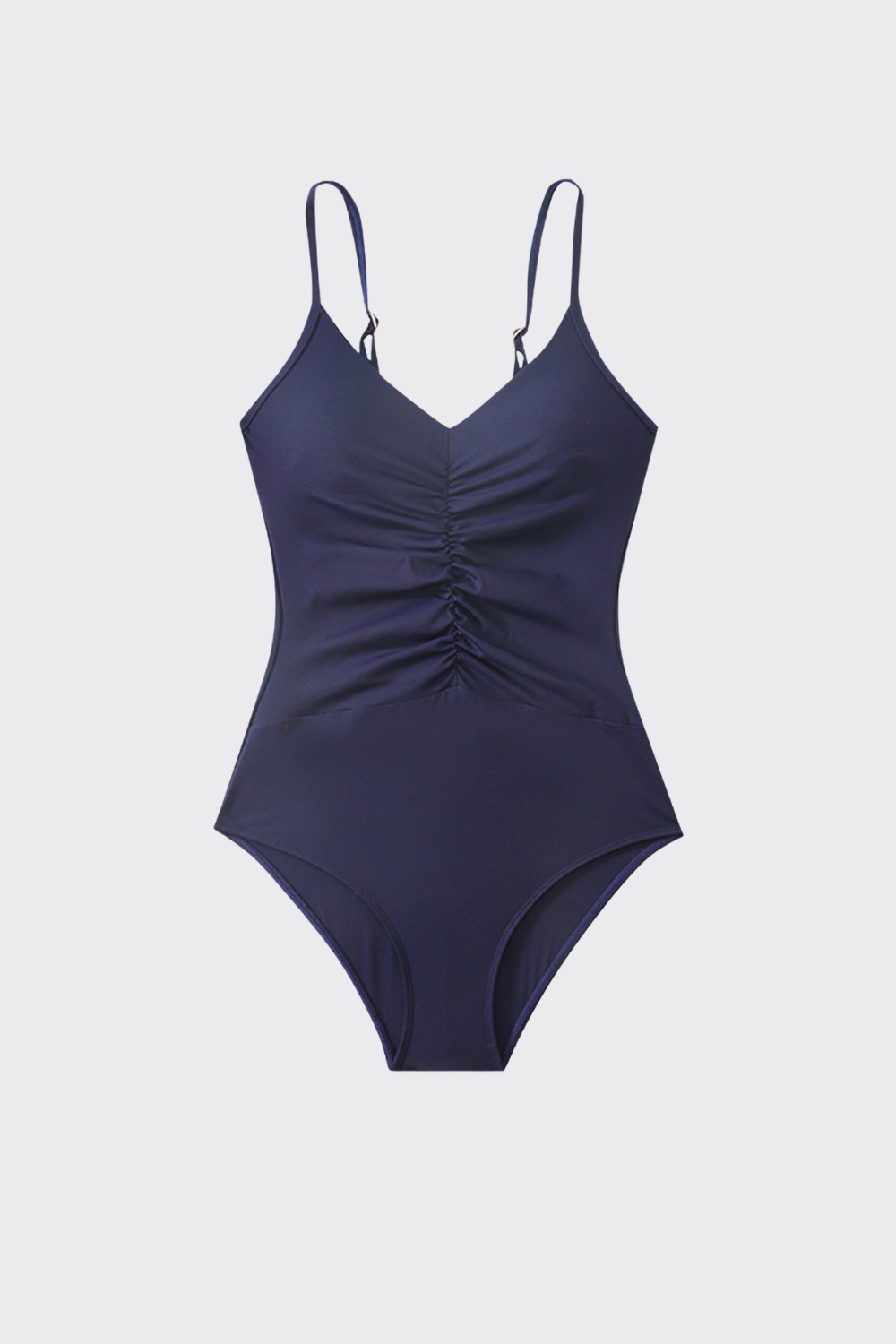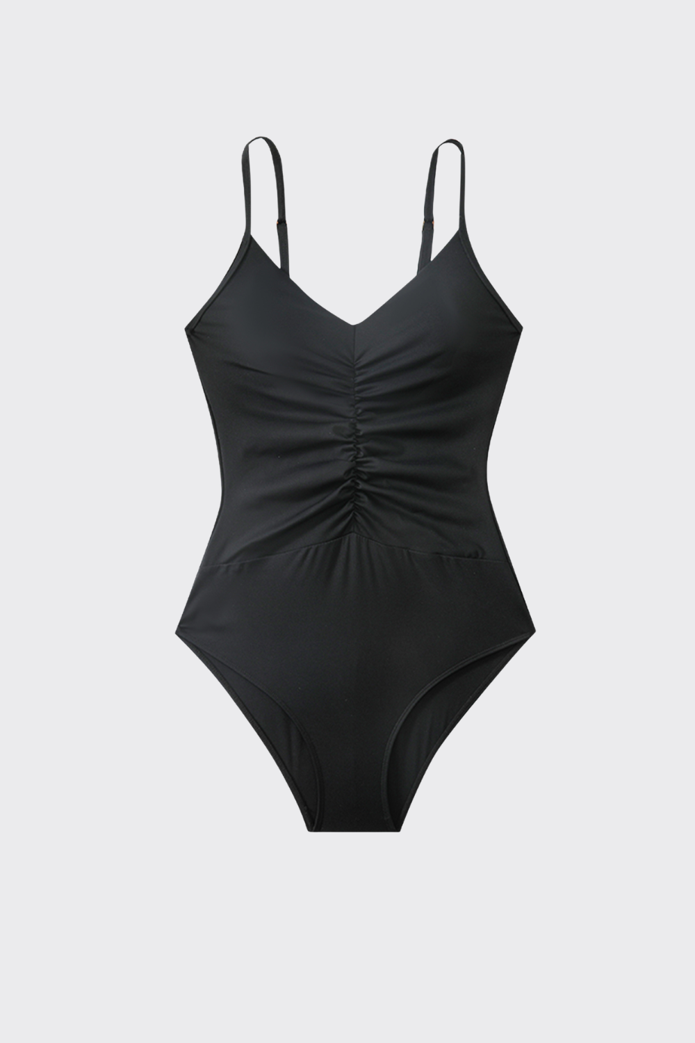 Un diseño elegante y funcional con escote en "V". La característica principal es su fruncido vertical pronunciado en la parte delantera, que nace desde el escote y recorre el torso, ayudando a definir el busto y la zona abdominal.
