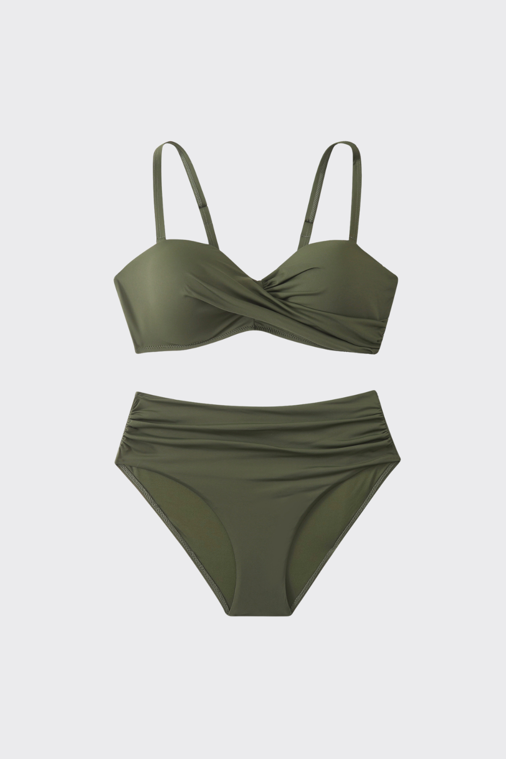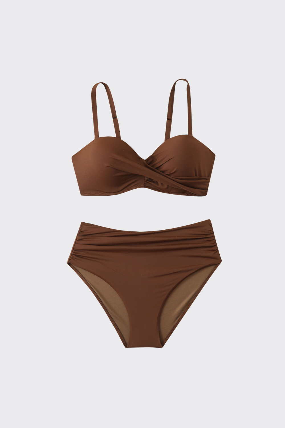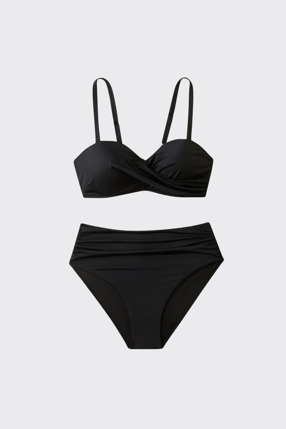Este bikini de dos piezas cuenta con un top de copas estructuradas y un sofisticado diseño cruzado que garantiza una forma impecable y un escote definido. Se combina con una braguita de talle alto y cobertura total, diseñada para esculpir la zona abdominal y ofrecer una silueta pulida de inspiración clásica.
