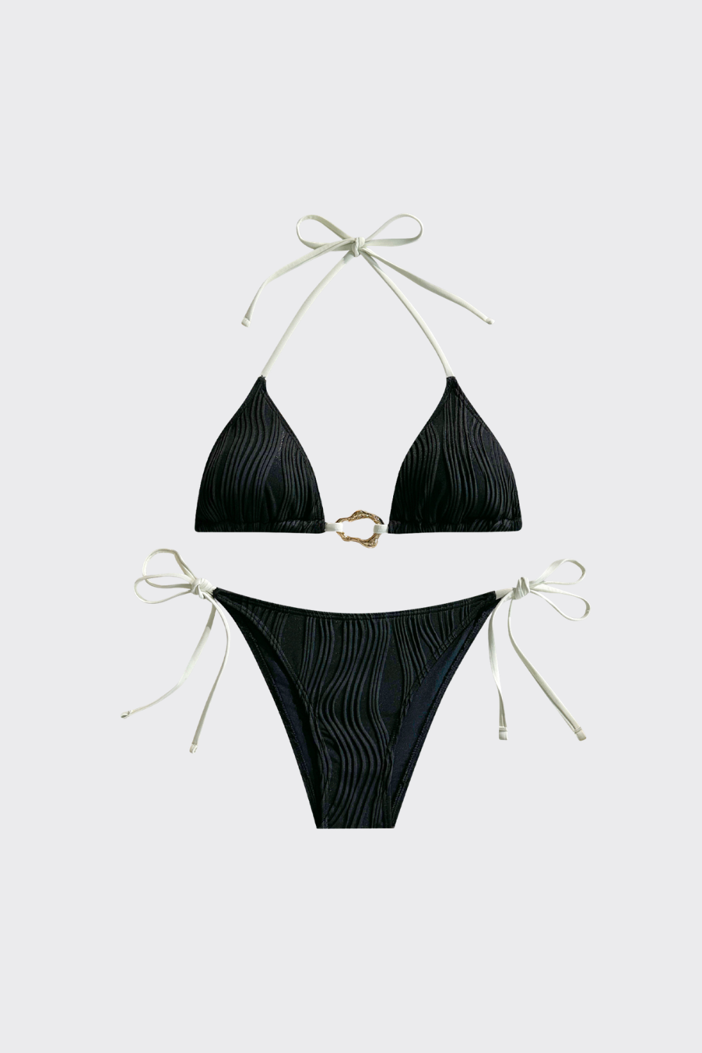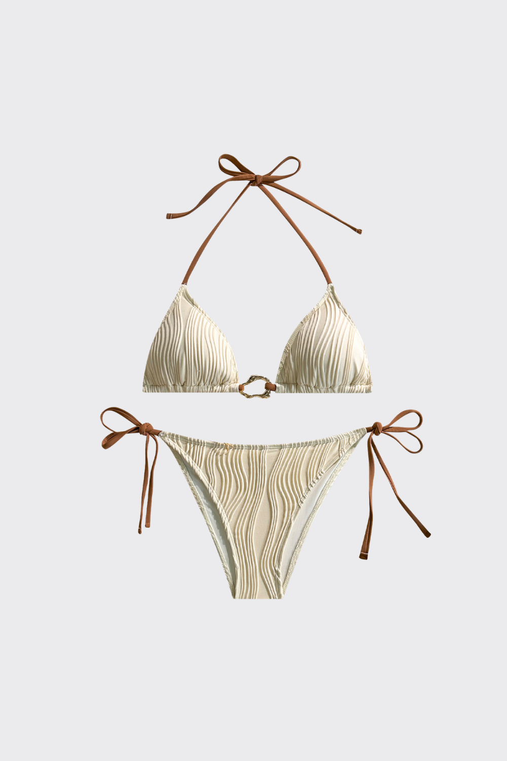 Un bikini que combina texturas visuales con un diseño impecable. El top de triángulo destaca por un aro metálico central que une las copas, creando un fruncido natural muy favorecedor. Las lazadas laterales en la braguita añaden ese toque juguetón y ajustable que tanto nos gusta para un día de playa.