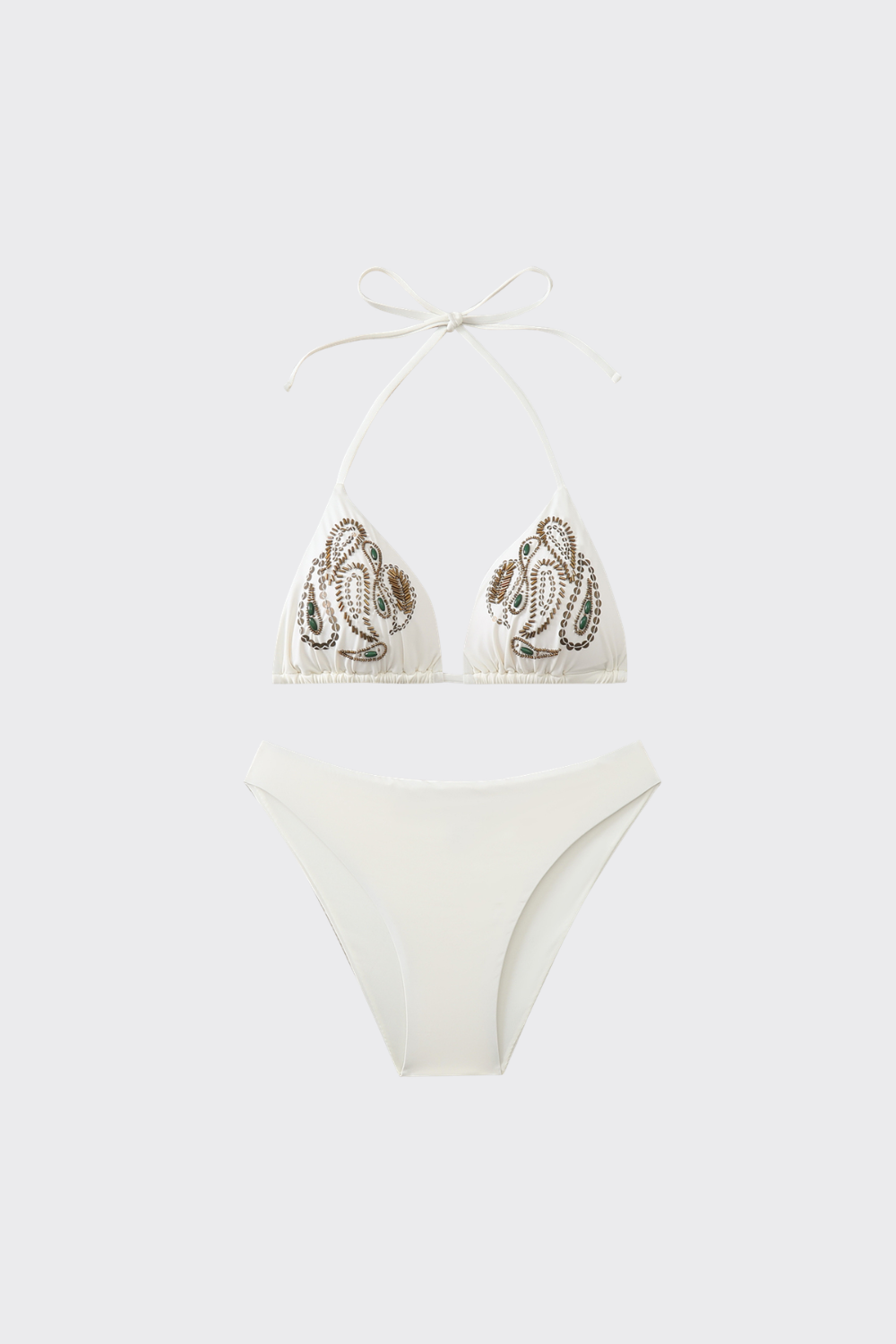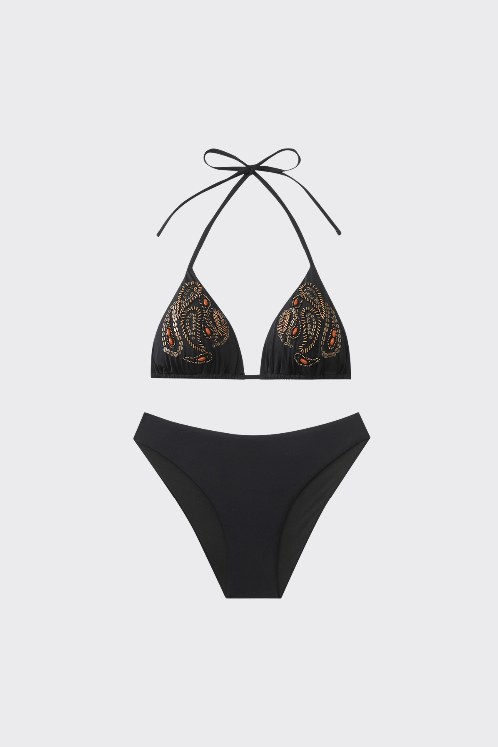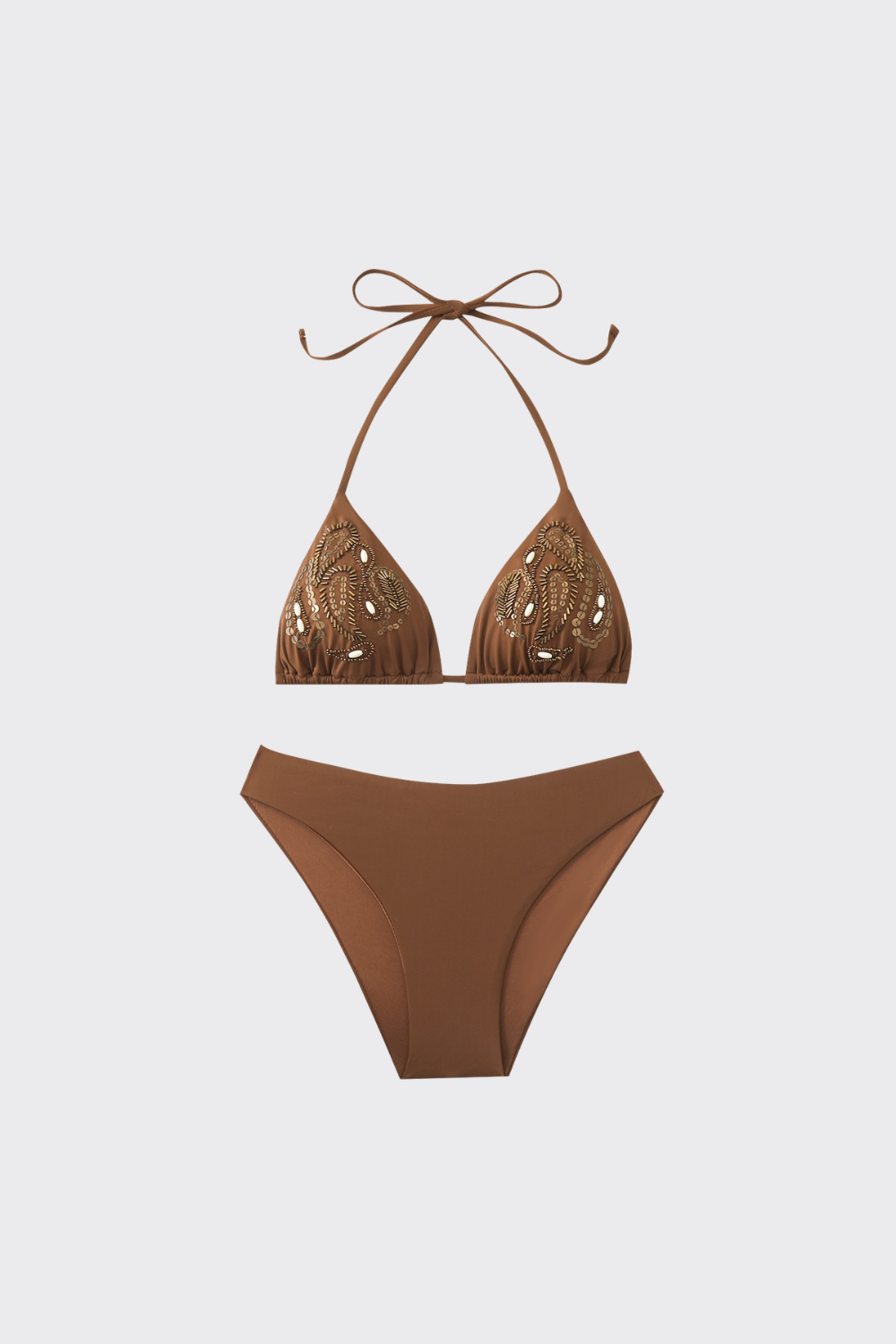 Este conjunto en color liso incorpora un detalle decorativo de brillo. El top de triángulo cuenta con aplicaciones de lentejuelas o abalorios dispuestos de forma circular en las copas, aportando un punto de luz. Se coordina con una braguita de talle medio con laterales anchos y costuras invisibles para un acabado limpio y cómodo.