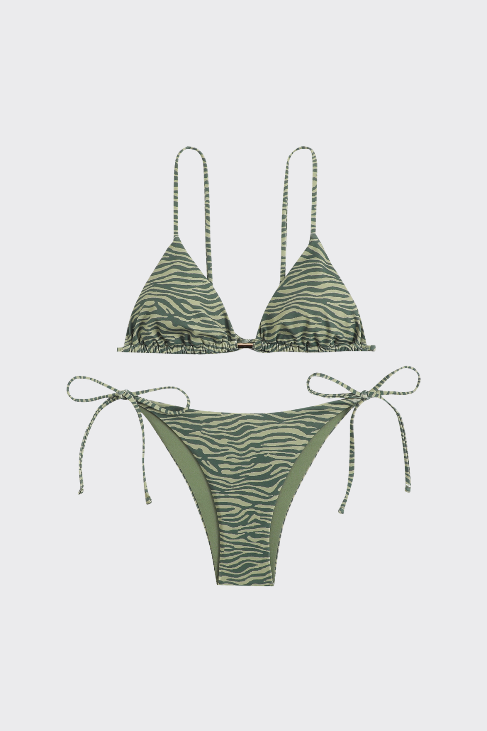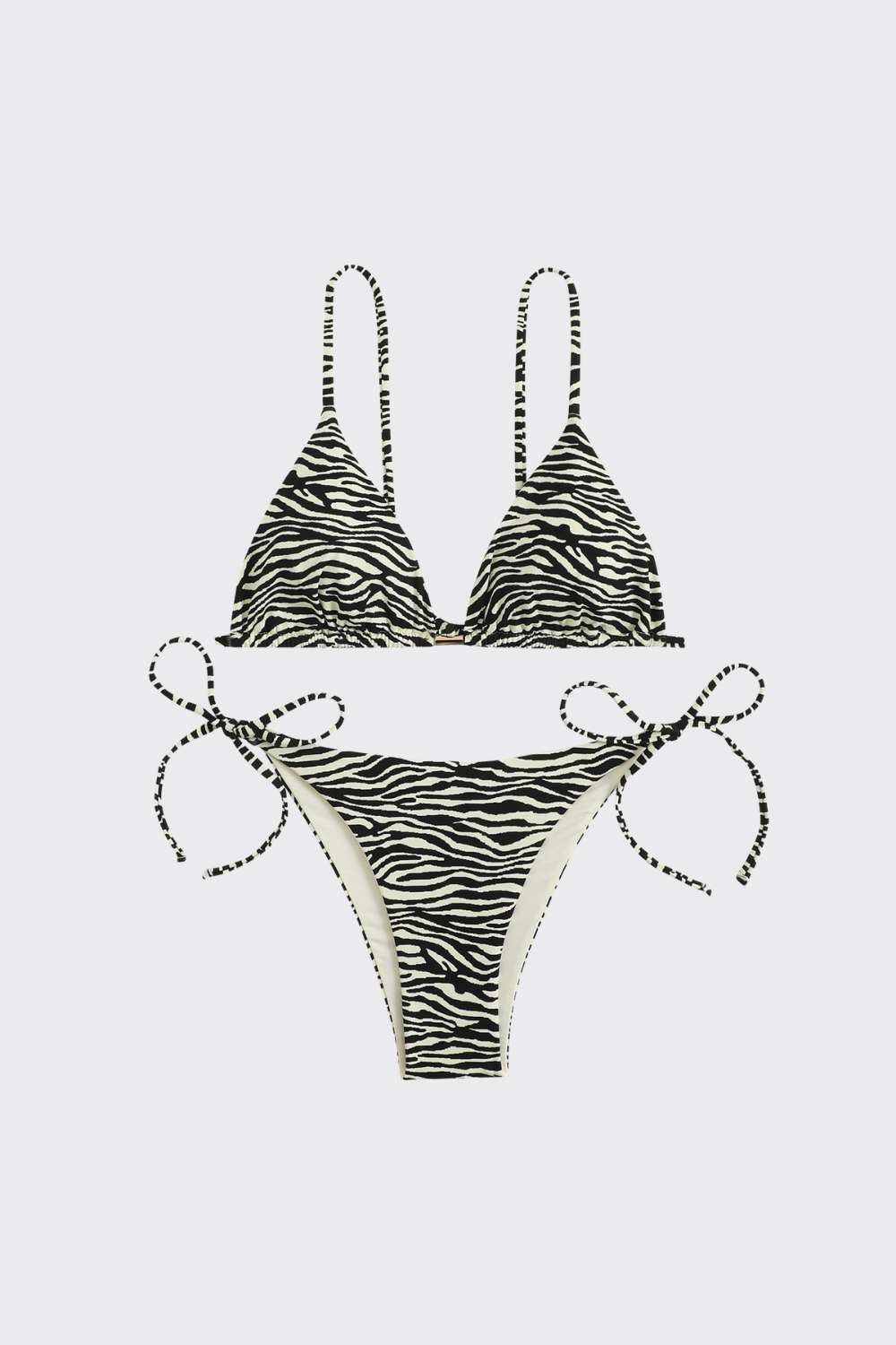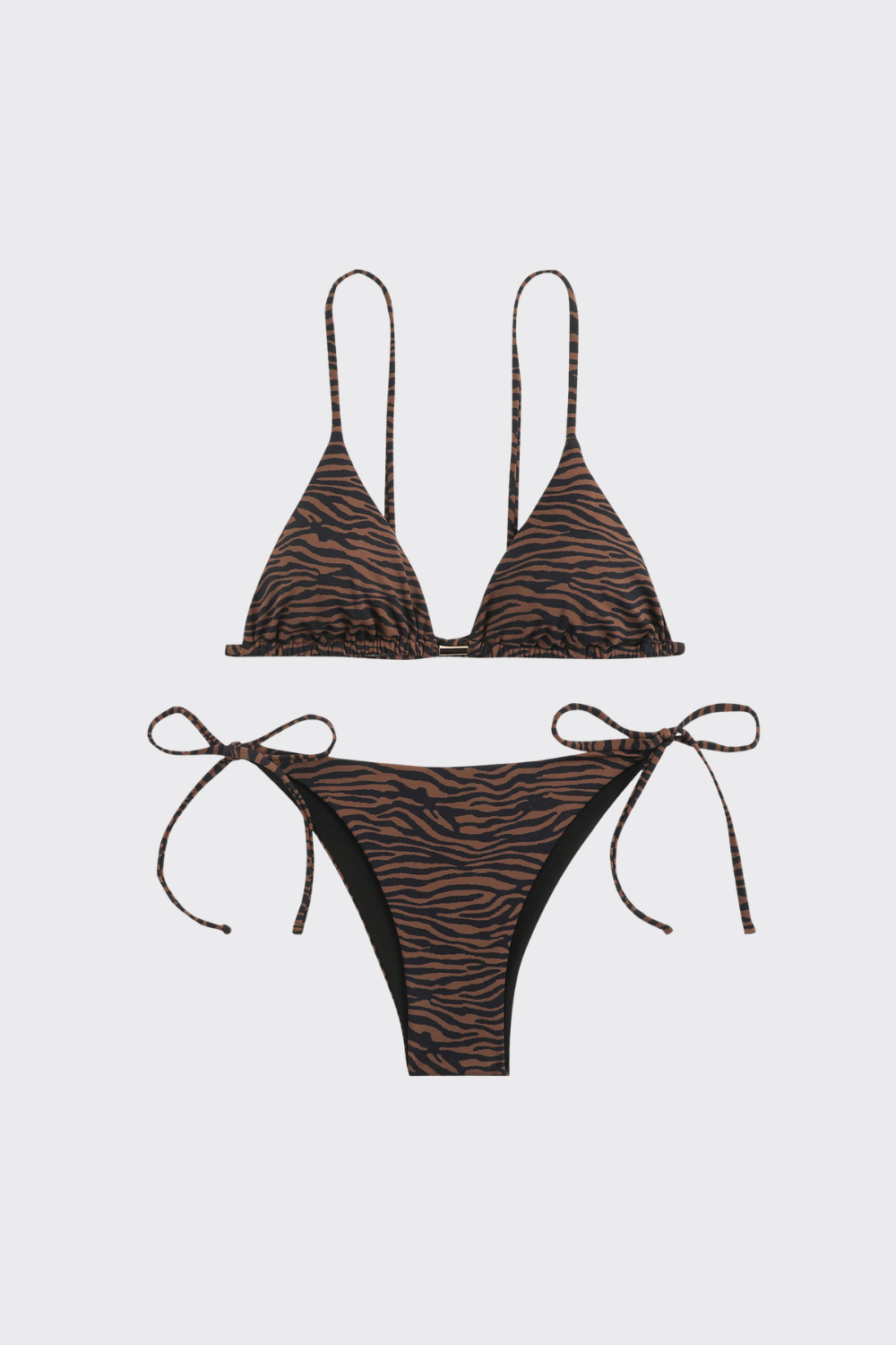 Conjunto con un estampado de cebra en tonos oscuros. El top de triángulo incorpora un herraje metálico en forma de barra en el centro del pecho. Se acompaña de una braguita de talle bajo con lazadas laterales muy finas, manteniendo una estética minimalista y sofisticada.