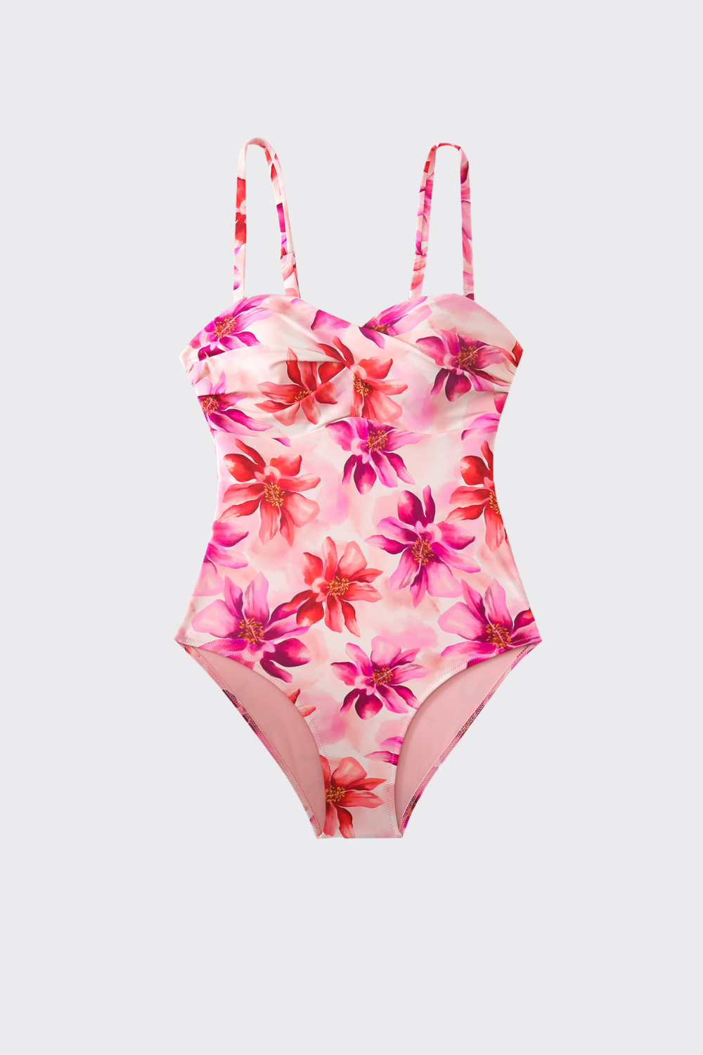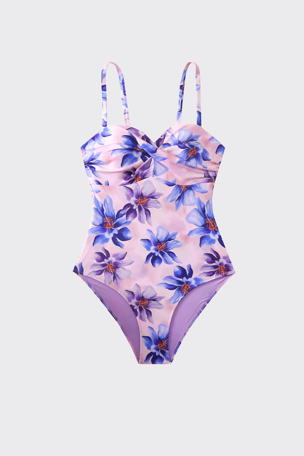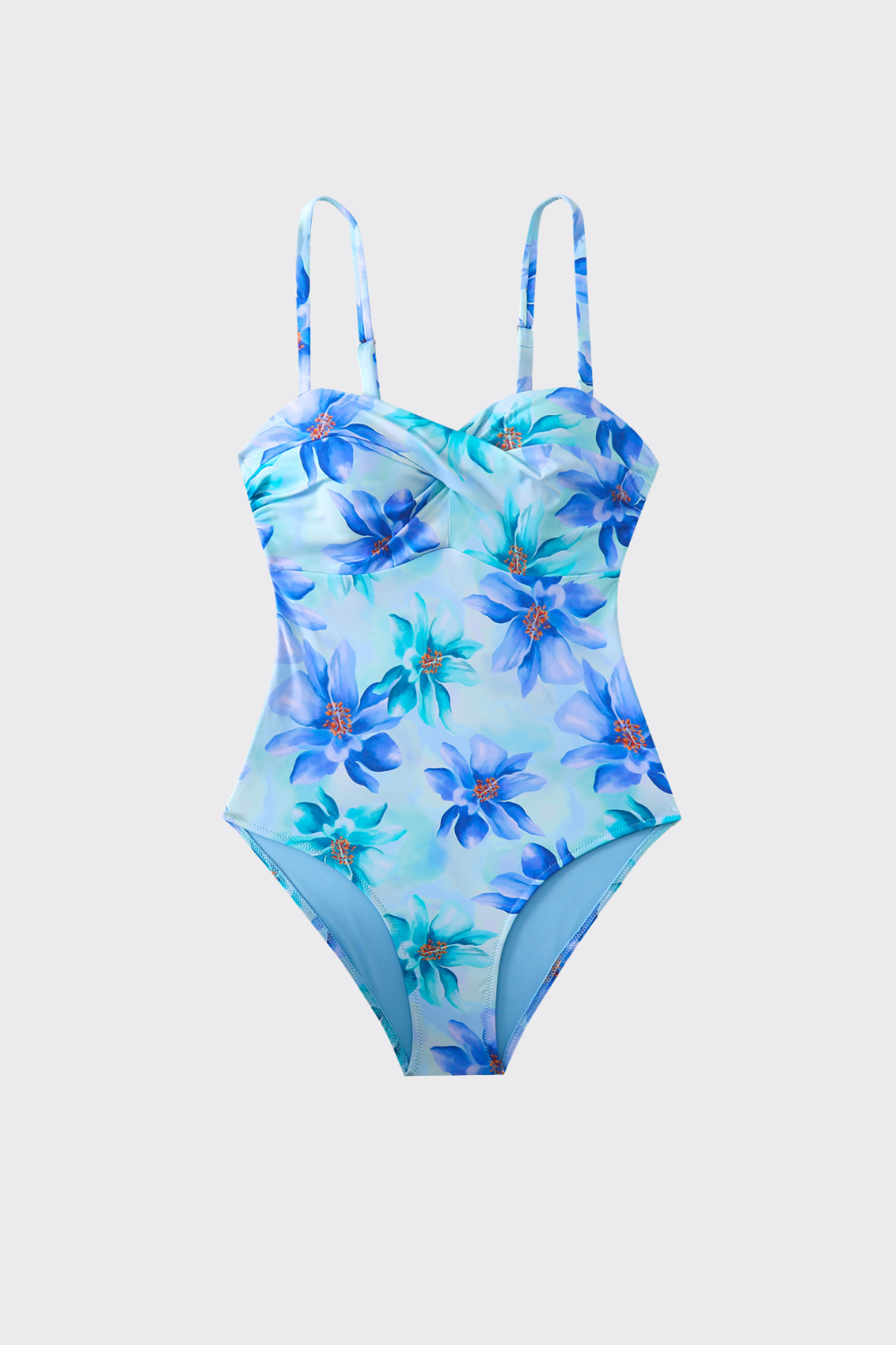 La feminidad es la protagonista en este diseño de pecho cruzado y fruncido. El detalle de torsión en el escote realza el busto de forma natural, mientras que los tirantes finos mantienen un look ligero. El estampado floral de estilo artístico se distribuye de manera armoniosa por toda la prenda, ofreciendo una silueta suave y romántica perfecta para tu próxima escapada.
