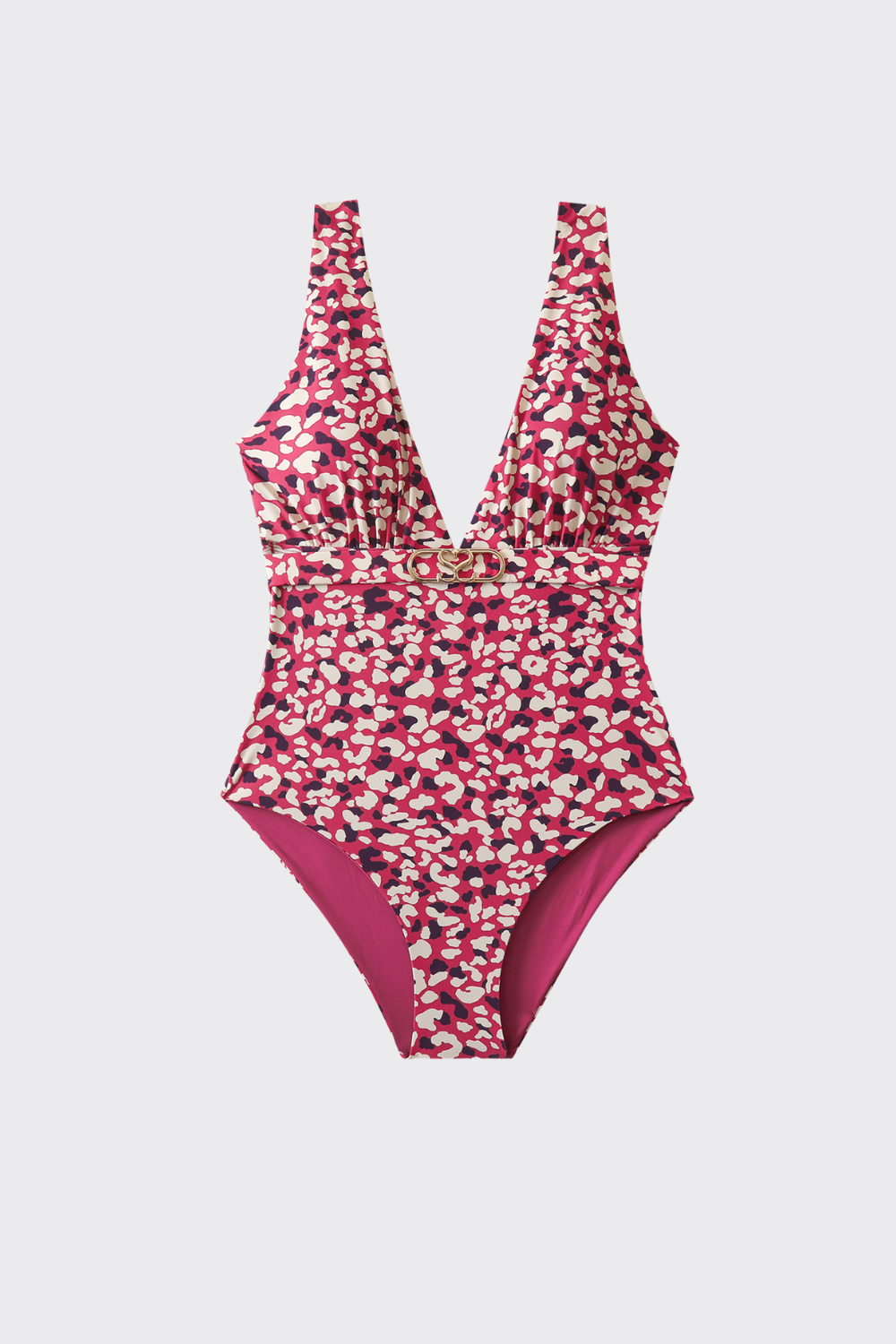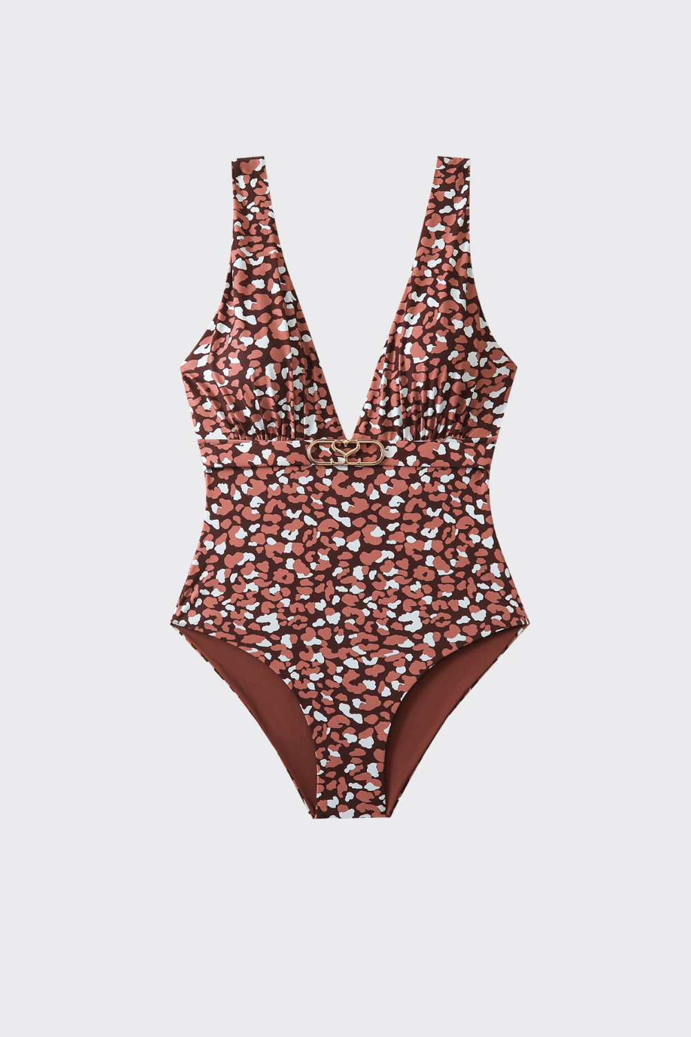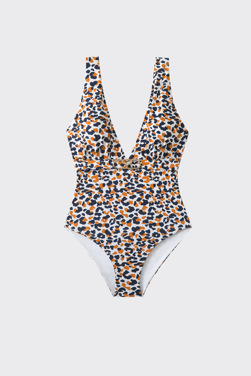 Traje de baño de una pieza con un estampado de manchas de guepardo. Presenta un profundo escote en "V" y una estructura sin aros que prioriza la comodidad. El diseño incluye un corte de pierna medio y una espalda abierta, ofreciendo una silueta clásica y funcional para la natación o el descanso.