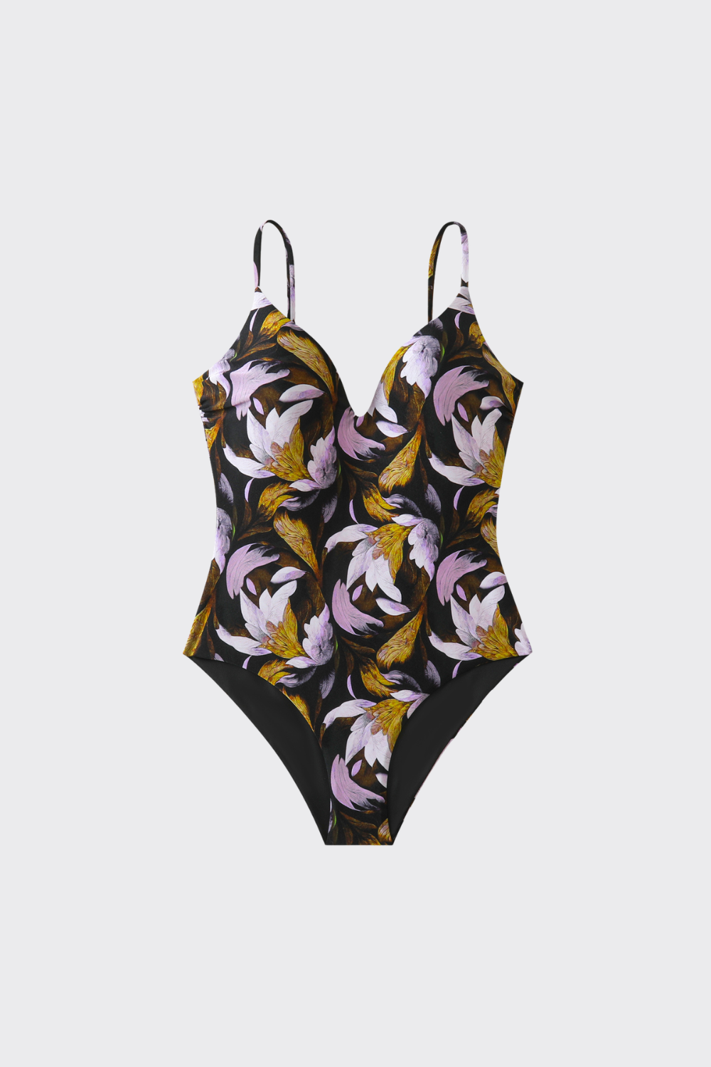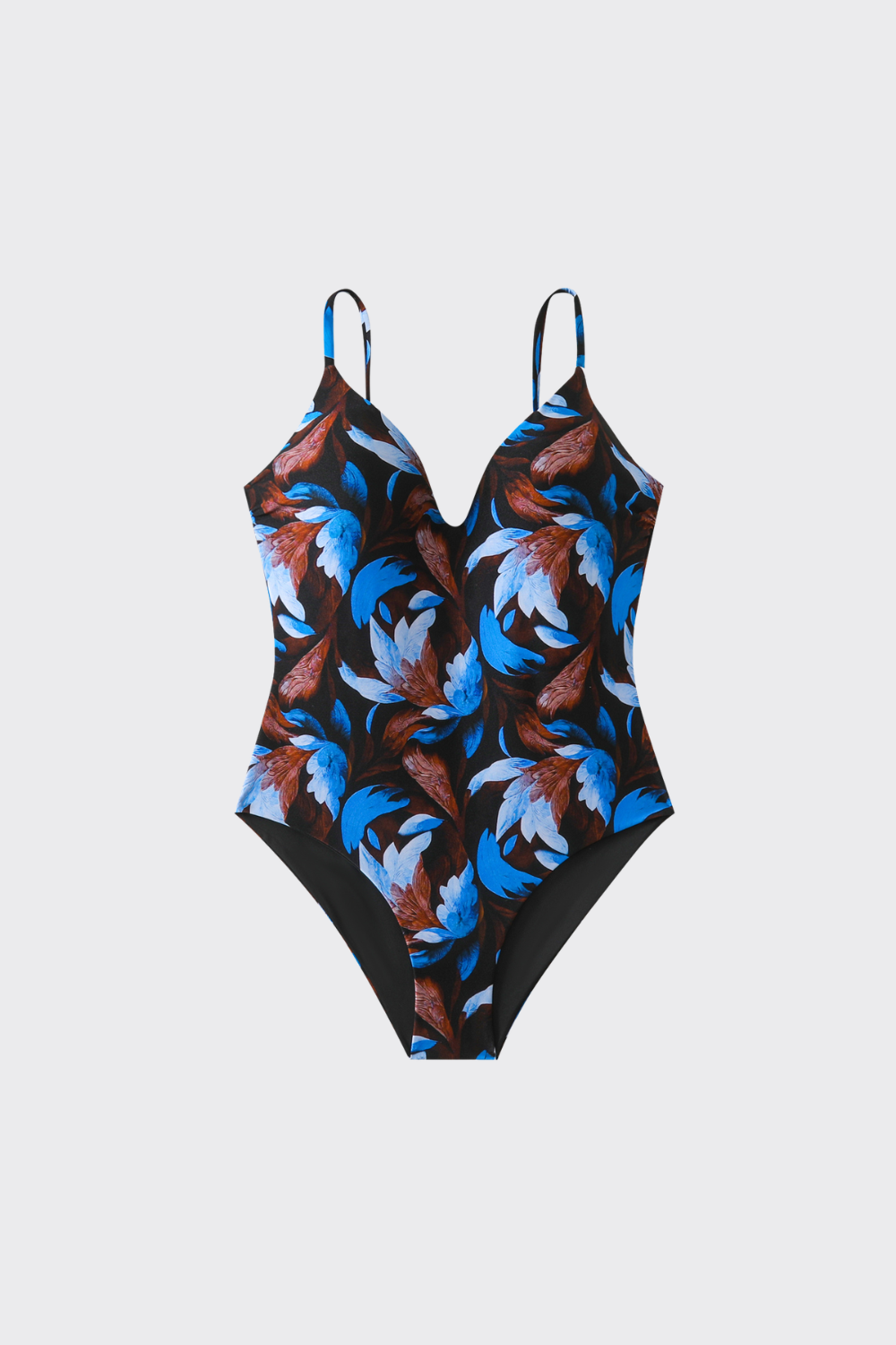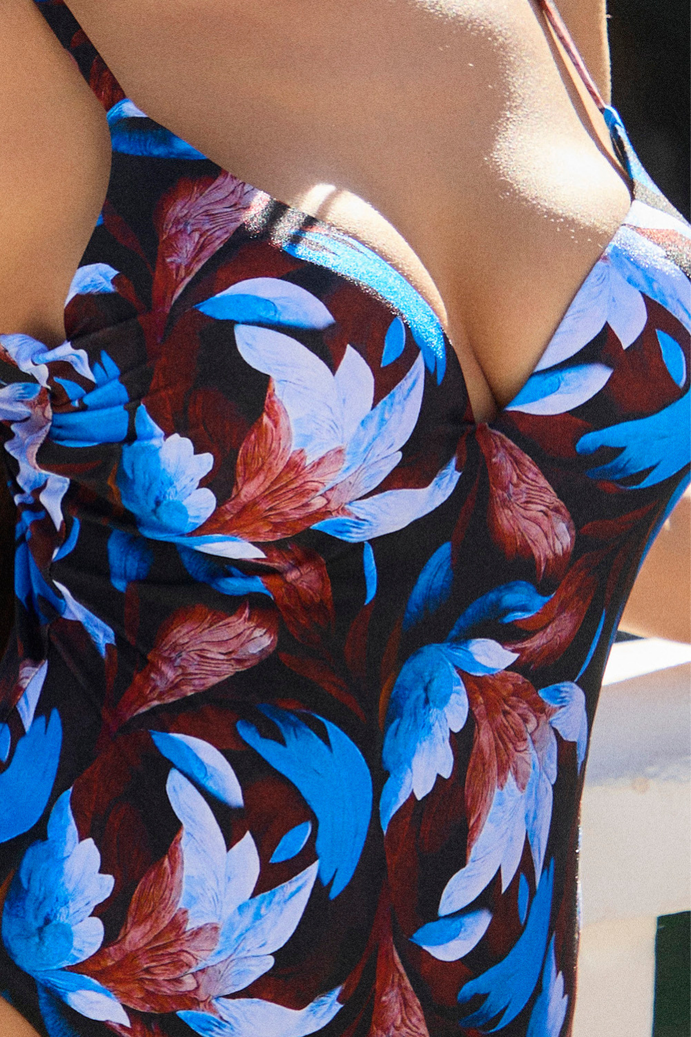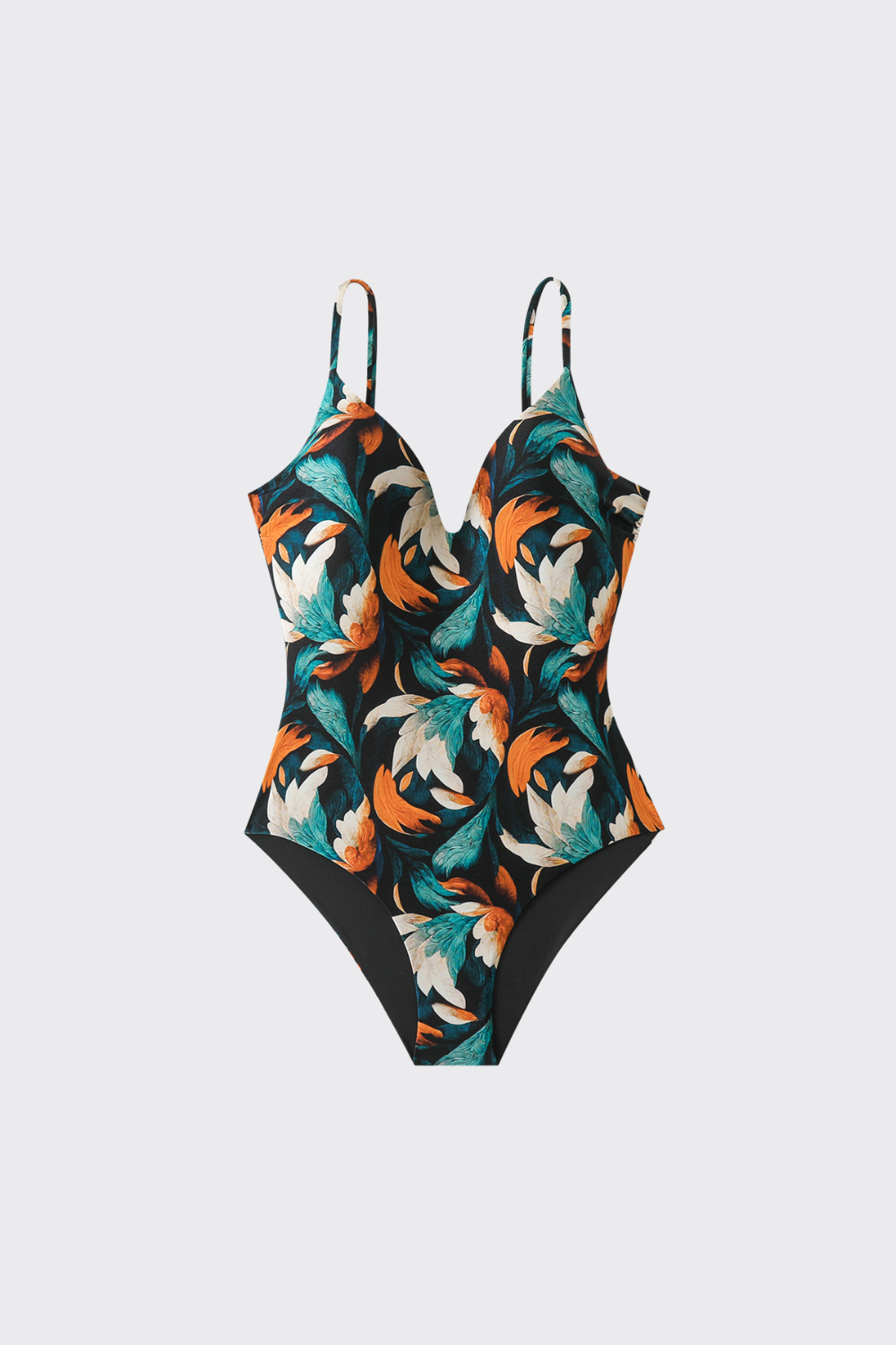 Ríndete al magnetismo de este bañador de una pieza. Con un escote en "V" profundo y un patrón floral de gran escala, ...