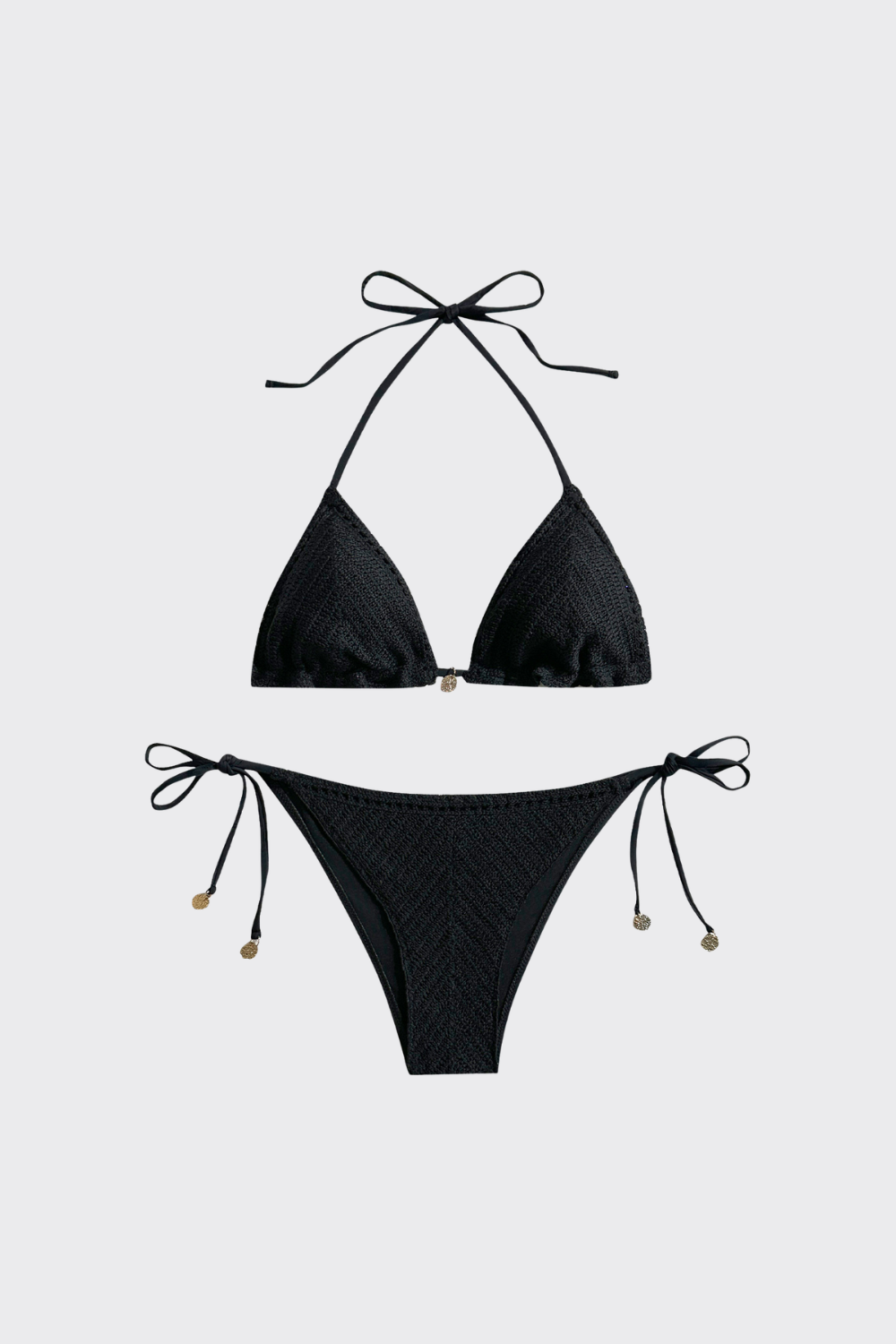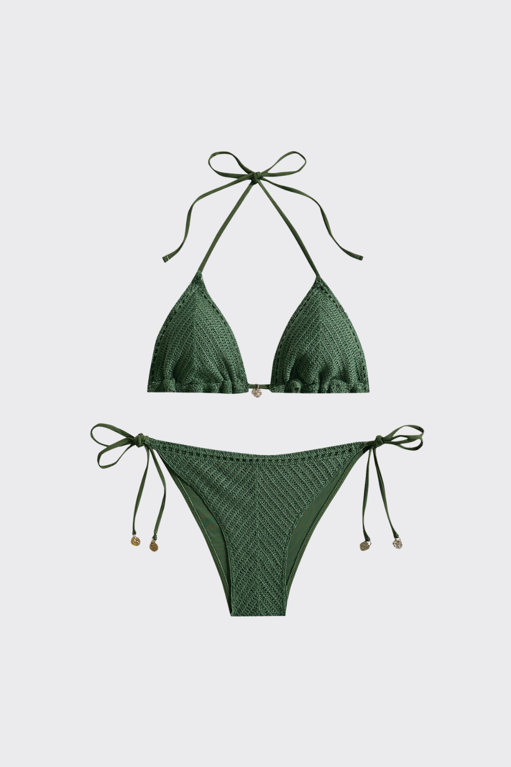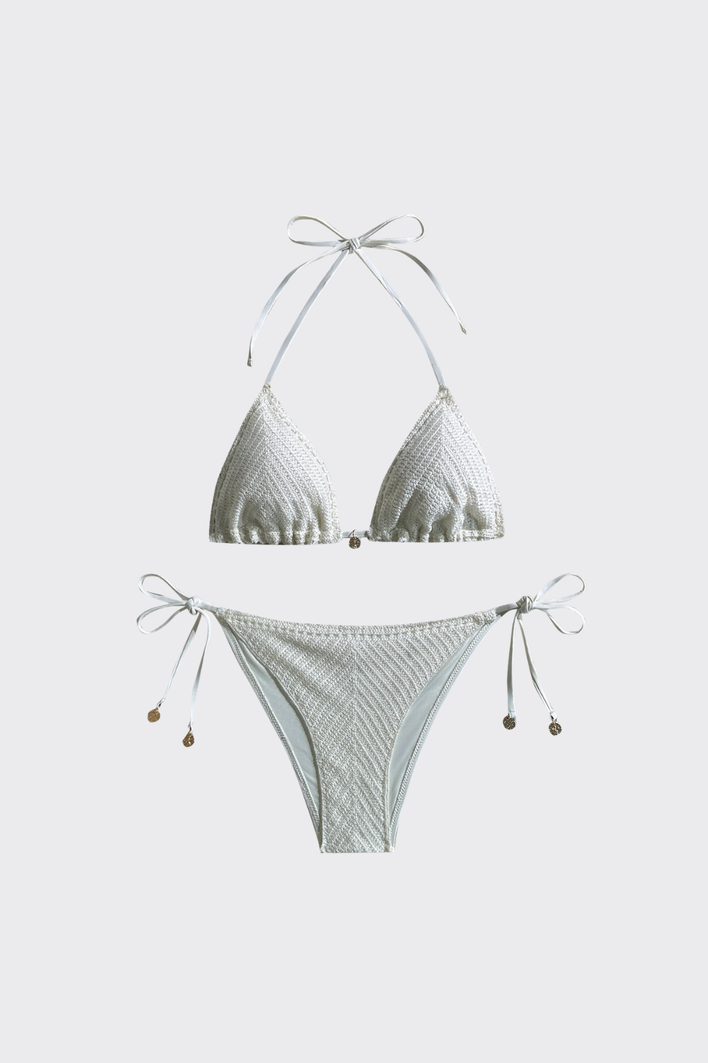 Modelo que destaca por la riqueza de su material, con un tejido que imita el crochet o panal de abeja. El top presenta copas triangulares deslizables con bordes limpios. La braguita de talle bajo incorpora lazadas laterales funcionales con cordones del mismo tejido texturizado, manteniendo una estética bohemia y orgánica.