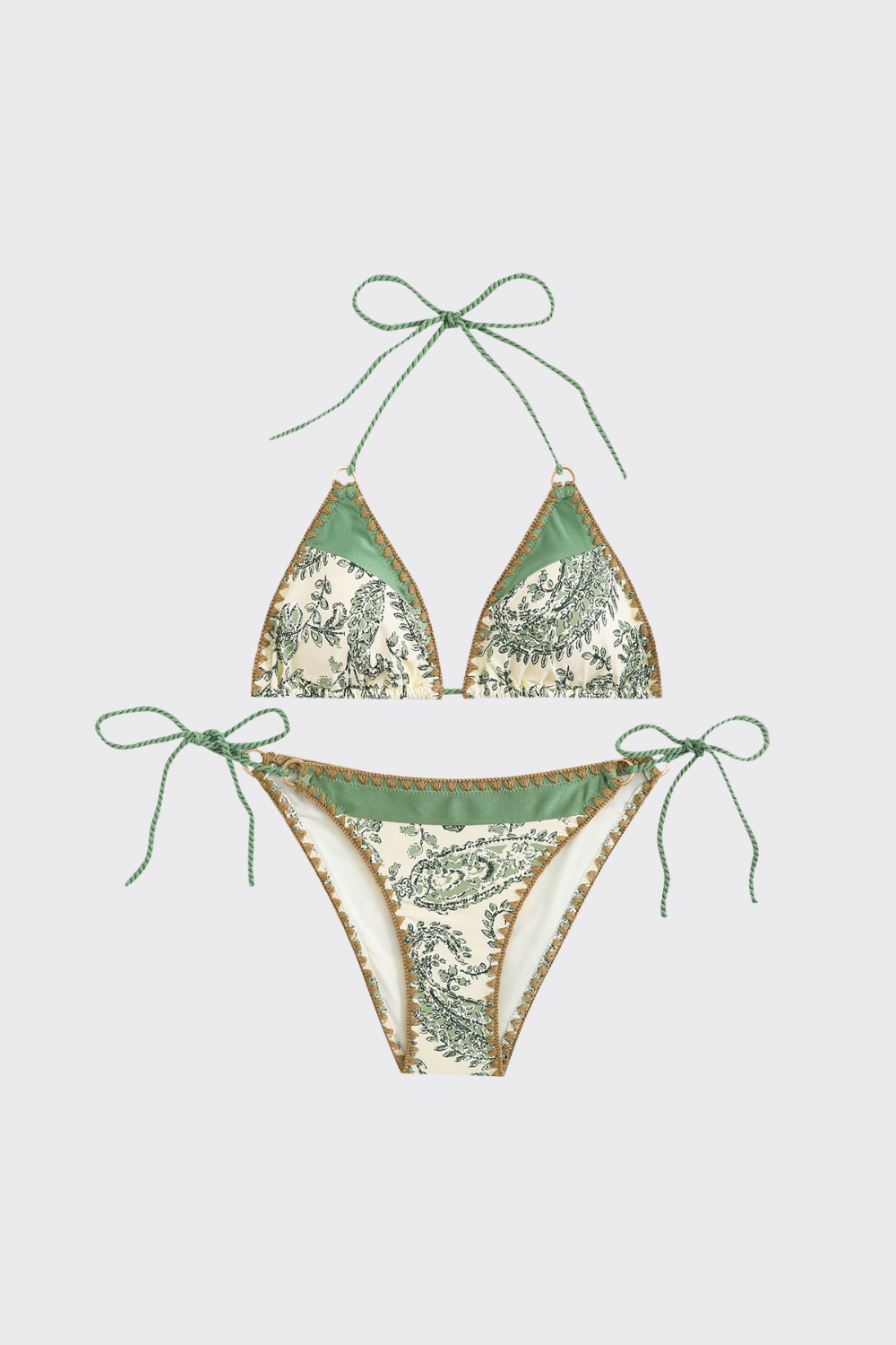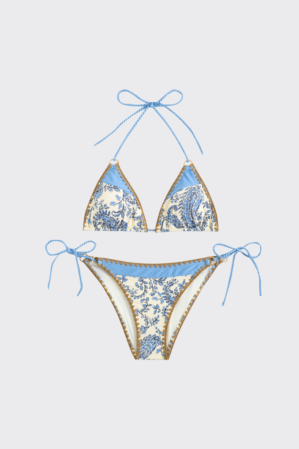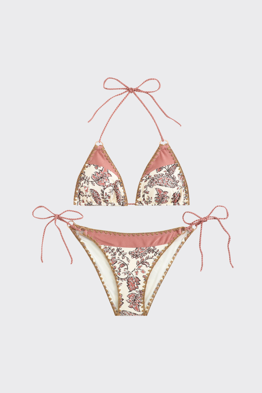 Este bikini de dos piezas presenta un top de triángulo que combina un estampado floral en el centro con un panel liso en los laterales. El ajuste se realiza mediante tirantes finos que nacen del vértice de las copas. La braguita es de talle bajo, mantiene el mismo patrón de estampado central y laterales lisos, y se cierra con lazadas en las caderas.
