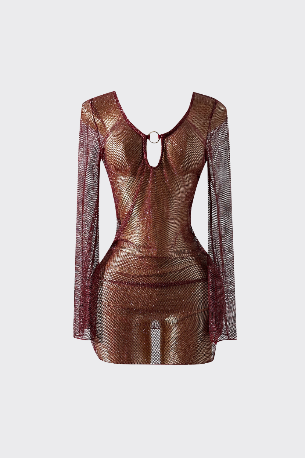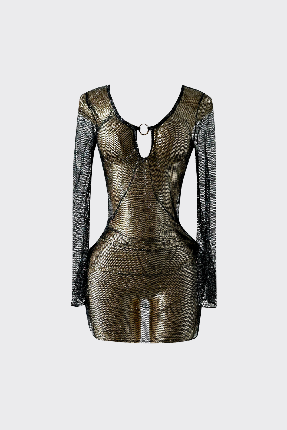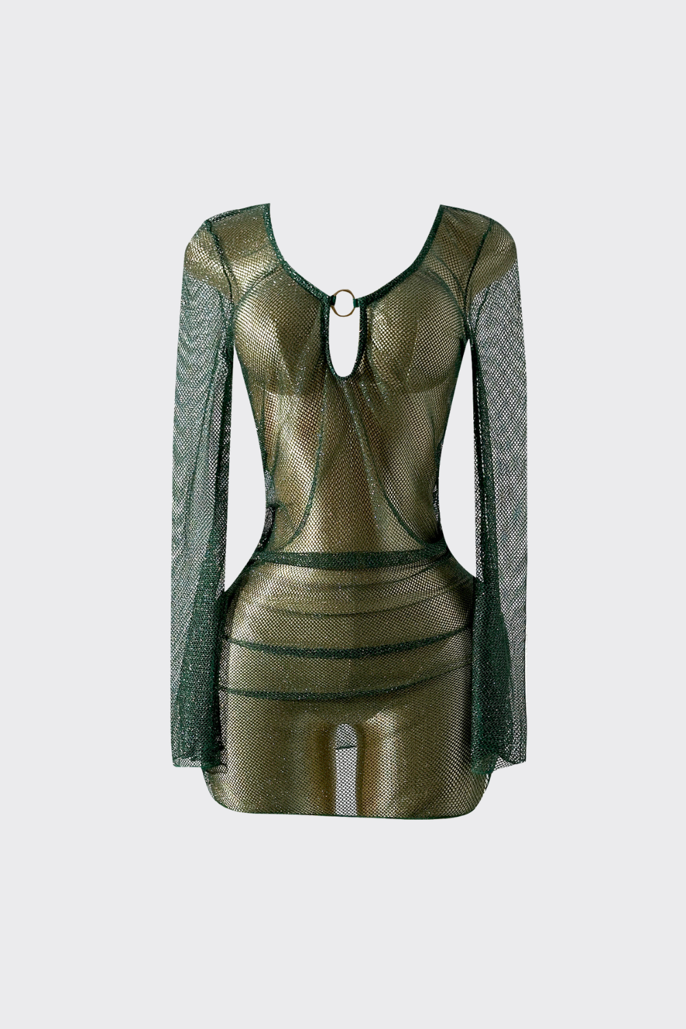 Este vestido de red destaca por su confección en malla de red abierta, ofreciendo un look atrevido y fluido. El diseño destaca por su escote tipo gota ajustable, que incorpora cordones finos para regular la apertura frontal según tu preferencia. Sus mangas largas de estilo acampanado y el bajo de corte mini crean una silueta bohemia y moderna, ideal para pasar de la arena a la terraza con total naturalidad.