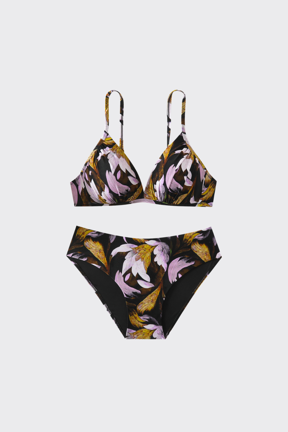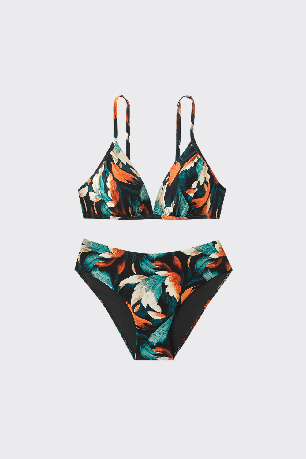 Diseñado para realzar, este bikini combina funcionalidad y moda. El top cuenta con aros y copas estructuradas que brindan un soporte excepcional y un escote definido. Los tirantes son finos y elegantes, conectando con una braguita de corte tradicional que destaca por su estampado botánico vibrante, perfecto para conectar con la naturaleza.